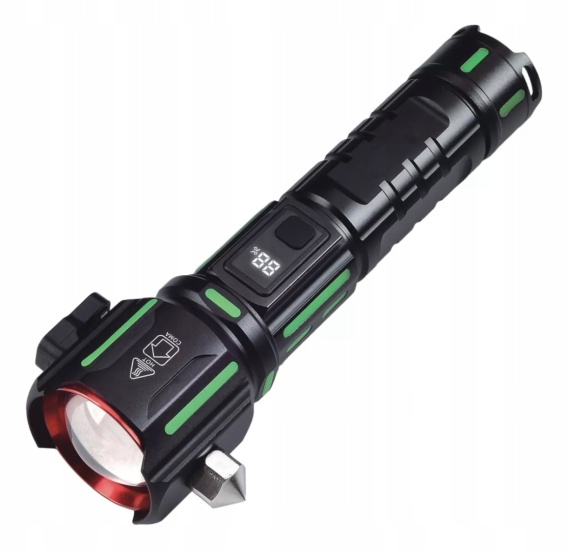 Zielone fluorescencyjne elementy świecące w ciemności ułatwiają lokalizację latarki w trudnych warunkach.